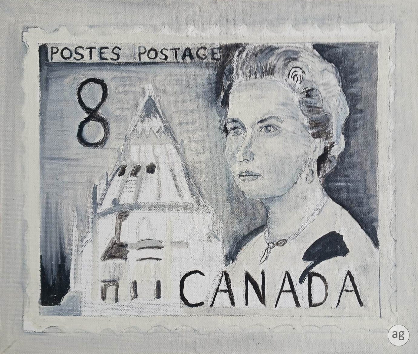 I had a stamp collection growing up, so one day I decided to paint a copy of one of the stamps in my collection. It happened to be a Canadian stamp with a portrait of Queen Elizabeth II. It could have been any other stamps. Stamps also have the same look and feel all around the world.